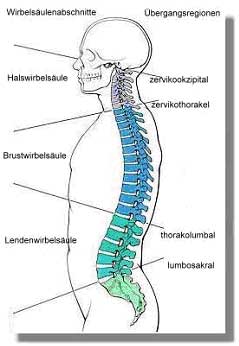 Die menschliche Wirbelsäule besteht aus 7 Hals-, 12 Brust und 5 Lendenwirbeln, sowie dem darunter befindlichen Kreuz- und Steißbein.
